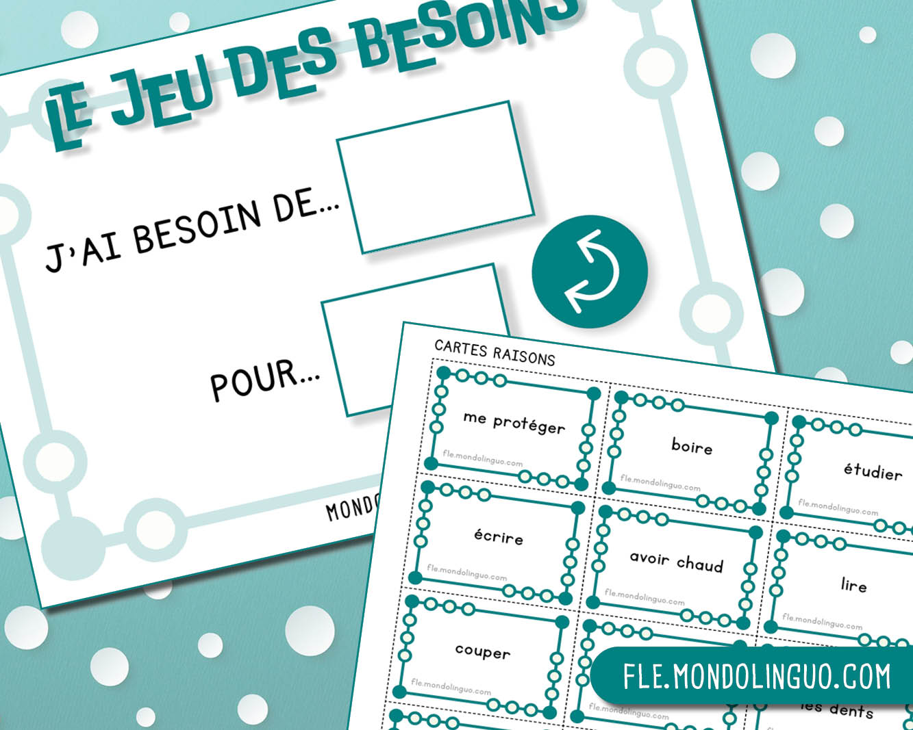 Dans ce jeu, le but est similaire : utiliser la structure « AVOIR BESOIN DE », mais je propose des cartes verbes à utiliser pour les raisons (pour être heureux, pour grandir, pour boire…).