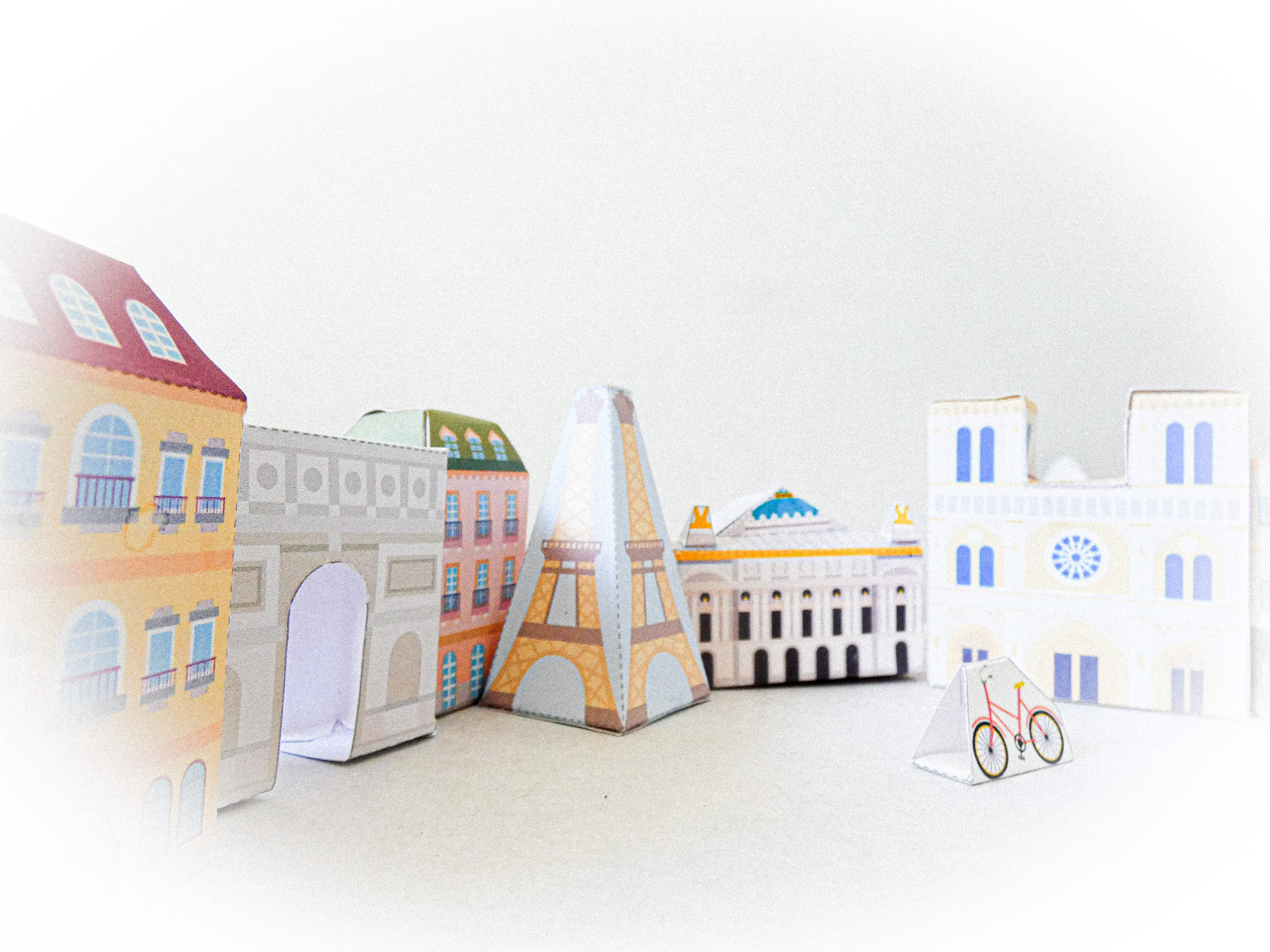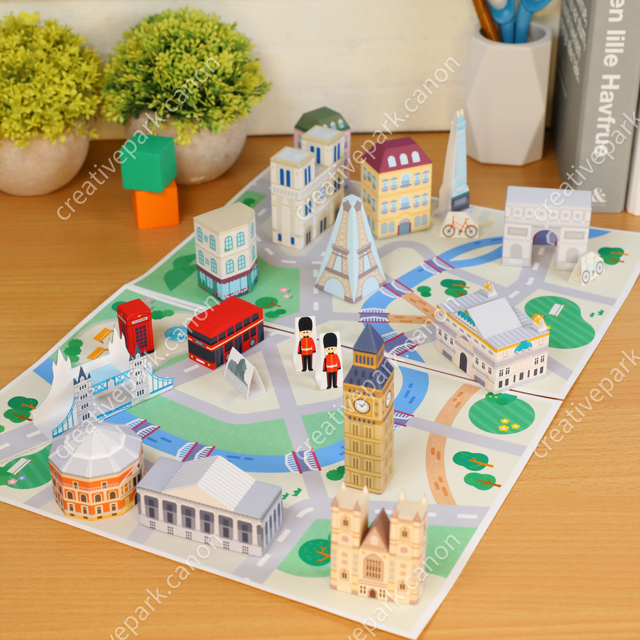 Le diorama du site Canon propose un plan de Paris, des immeubles, deux vélos, la tour Eiffel, Notre-Dame, l’opéra Garnier, l’Obélisque et l’Arc de Triomphe ! Les instructions sont dans le deuxième PDF.