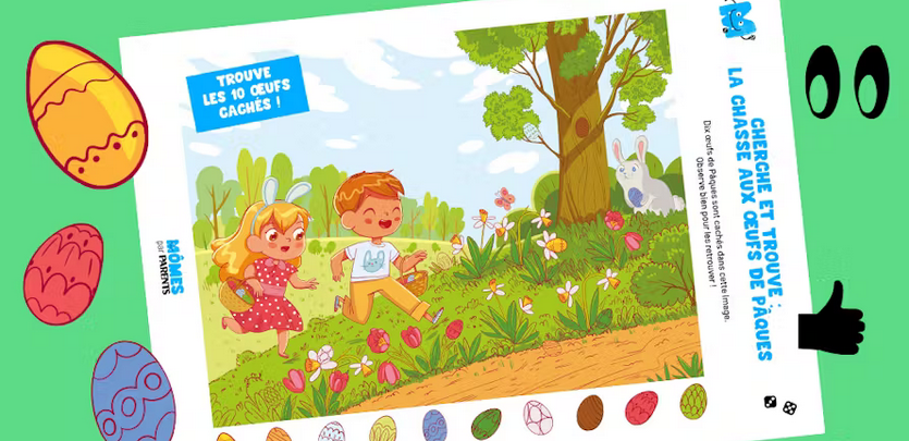 Sur le site Mômes, vous trouverez de nombreux jeux sur Pâques : un memory, un jeu de plateau, un jeu d’observation et aussi un cherche et trouve : un jeu à imprimer idéal pour travailler le vocabulaire des couleurs et des motifs tout en s’amusant. Les enfants peuvent aussi décrire l’image, le paysage, les personnages, leurs vêtements, ou même le temps qu’il fait. Ils peuvent laisser libre cours à leur imagination en inventant une histoire ou un dialogue entre les enfants !